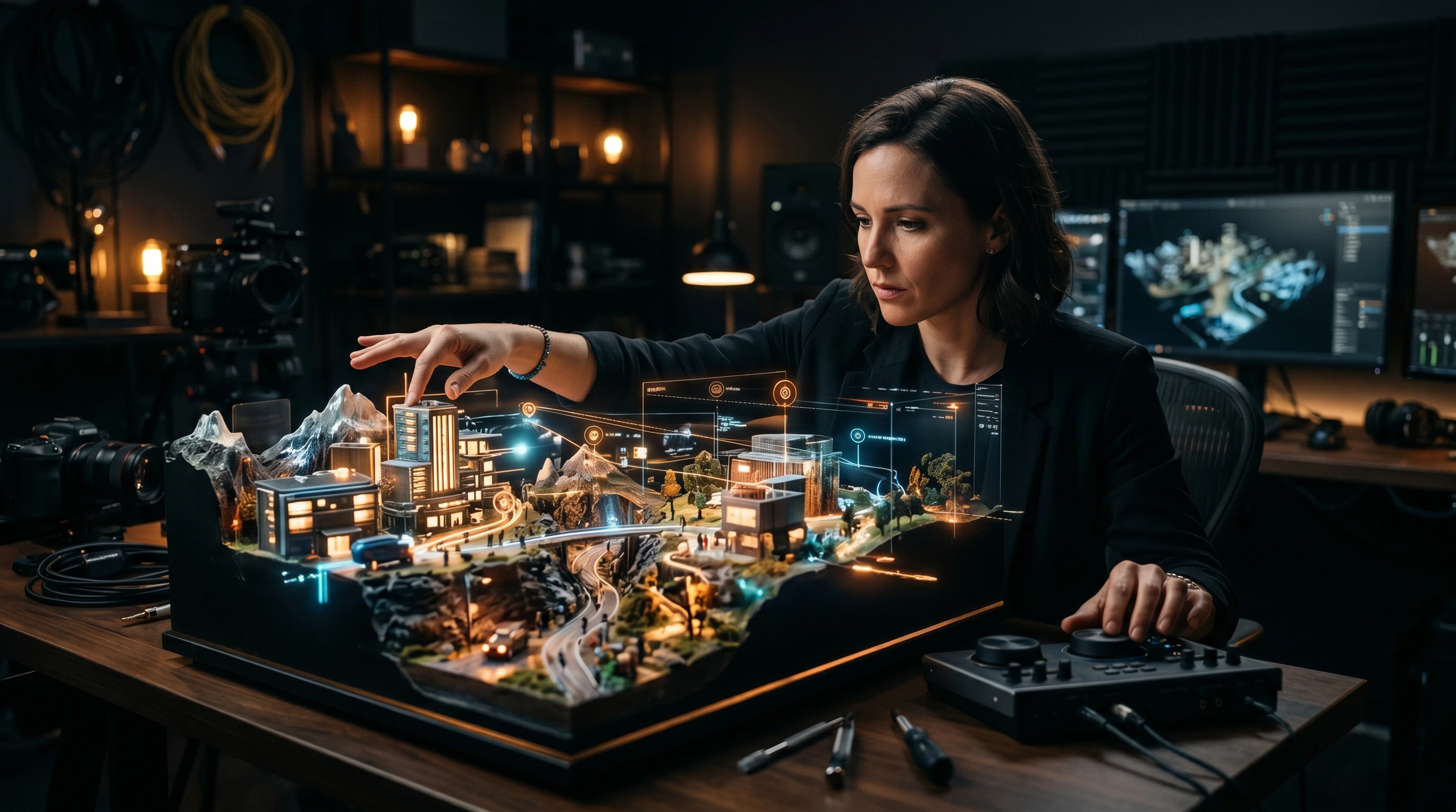 You can adjust lighting, scene composition, storyline progression, physical elements, and environmental conditions in real time as the 3D world evolves.