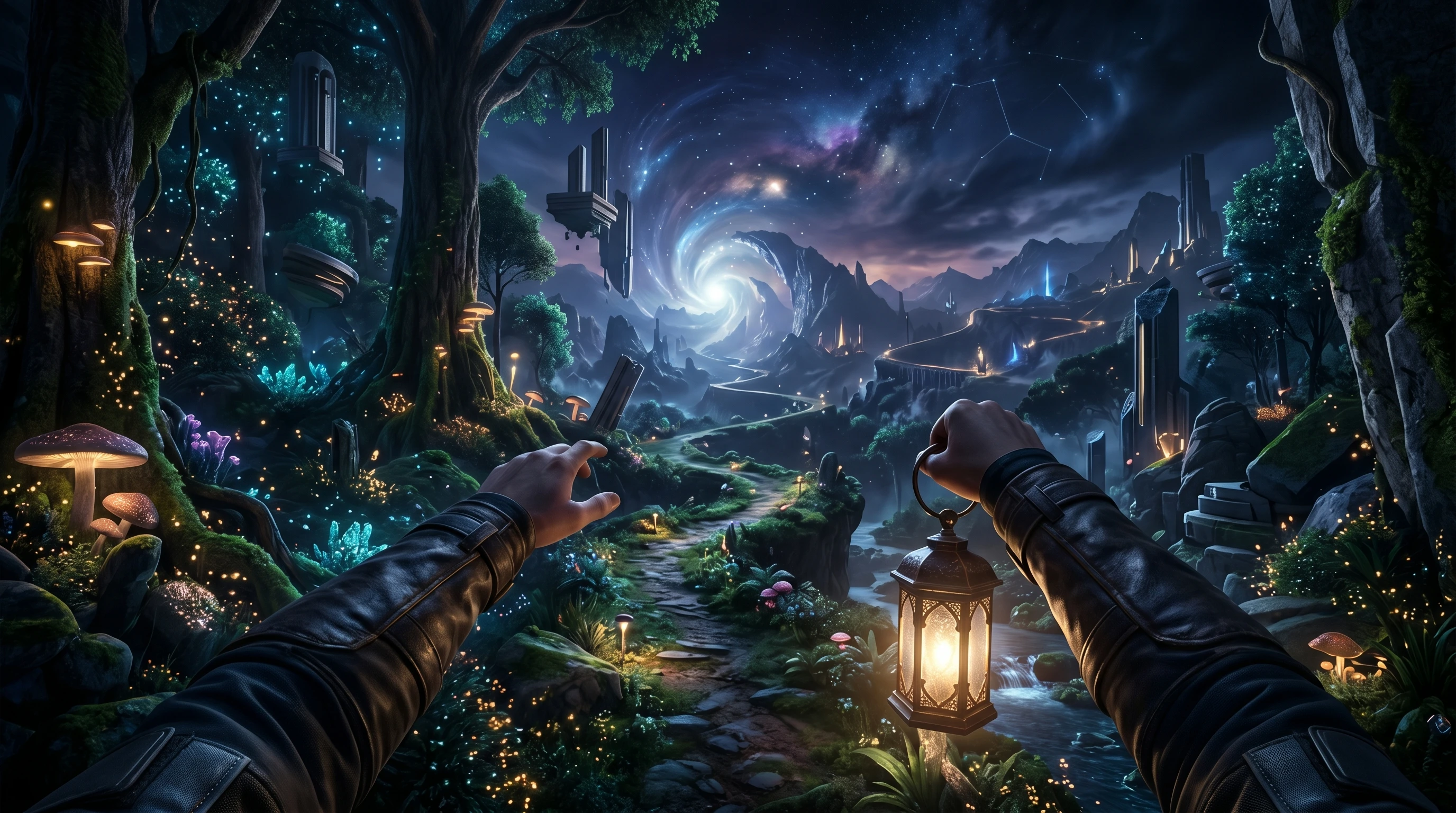 Prompts that describe expansive, interconnected spaces with multiple paths or areas to explore produce the richest Wandering mode experiences.