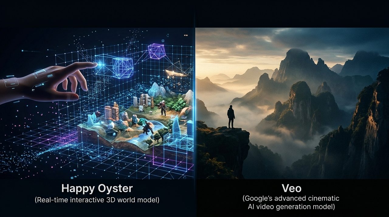 Happy Oyster (Real-time interactive 3D world model) compared to Veo (Google's most advanced cinematic AI video generation model.).
